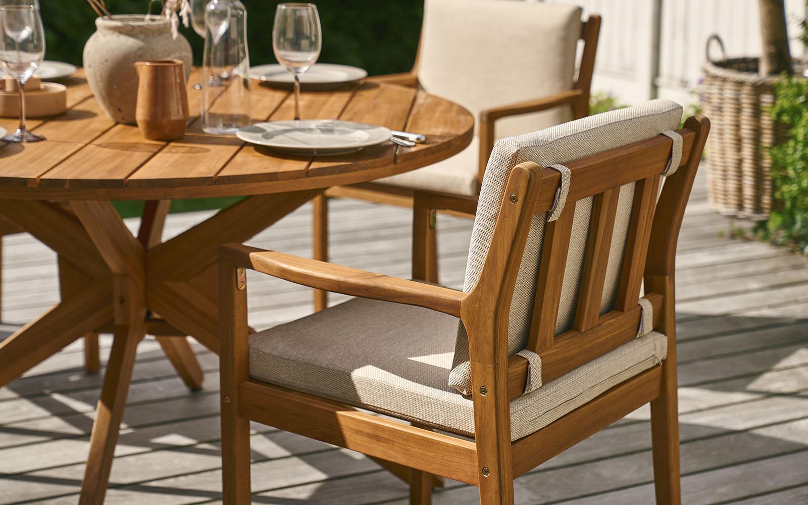 Polyrattan er et holdbart materiale, der kan modstå det danske vejr, samtidig med at det skaber en indbydende og afslappet stemning. Når polyrattan kombineres med et havebord i træ, for eksempel teak eller akacie, opnås en smuk balance mellem det naturlige træ og det klassiske, flettede materiale. Denne kombination giver møblerne et afslappet udtryk, der passer til en komfortabel og klassisk spiseplads.