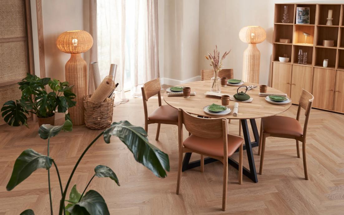 Ved at matche træfarverne på dit bord og dine stole kan du skabe en dejlig ro i hjemmet. Hvis du vil tilføje lidt ekstra personlighed og varme, kan du overveje cognacfarvet læder til et lyst egetræsbord og stole. Det giver et flot sammenspil og skaber en indbydende, hyggelig stemning, der virkelig gør rummet til dit eget.